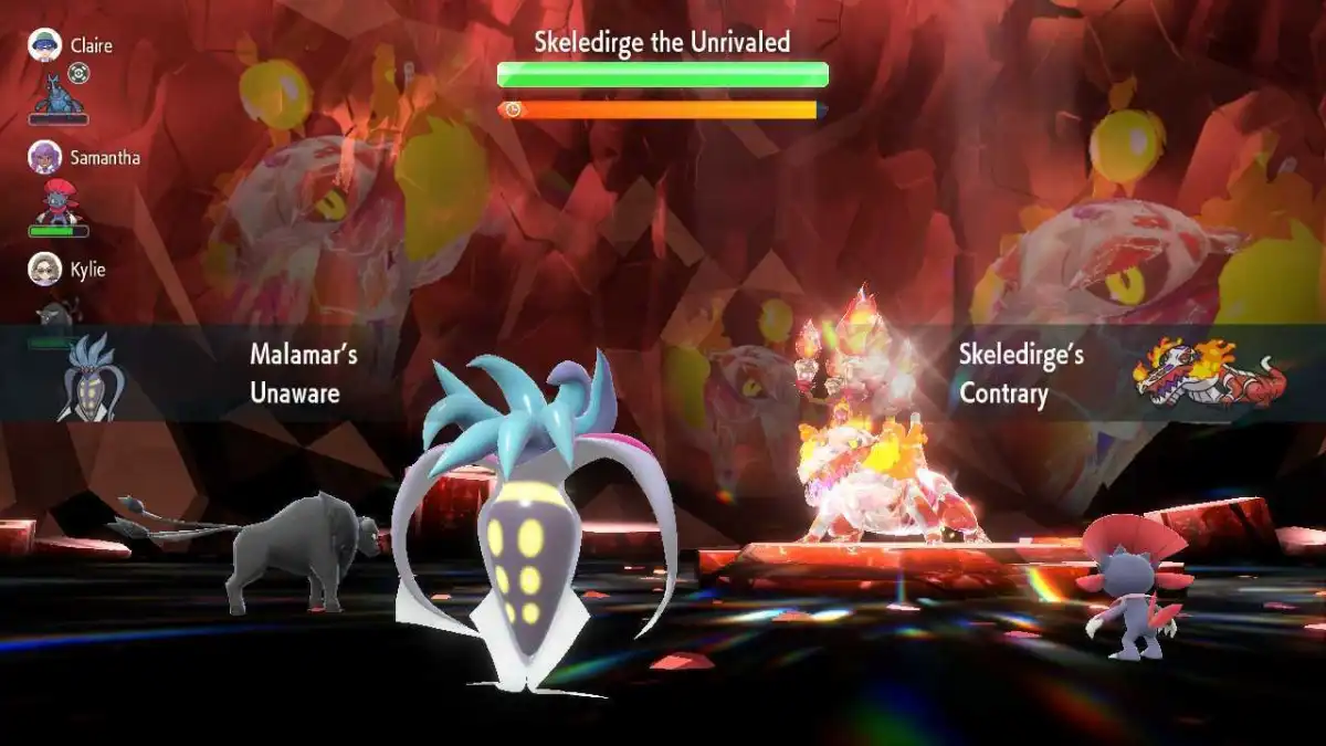 马拉玛无法独自击败无双骷髅,但它是本次 Tera Raid 中最强的辅助神奇宝贝之一。 Contrary在使用火炬之歌时会降低Skeledirge的特殊攻击而不是提高它,并且你可以通过技能交换赋予它此能力。然后确保你将 Unaware 换到你的一名 NPC 队友身上,这样你就可以利用降低的特攻。