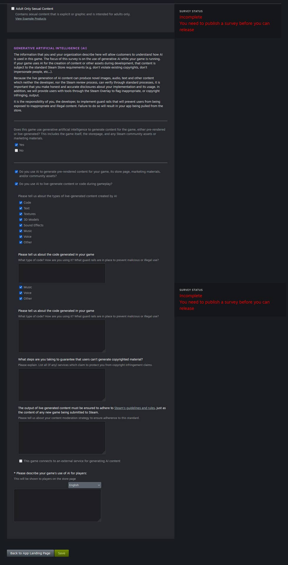 任何向 Steam 提交游戏的人都需要填写一份表格,其中包括“一般”、“成熟”和“生成人工智能内容”等部分。最后一部分分为两类:预生成和实时生成。这些部分之前有以下描述: