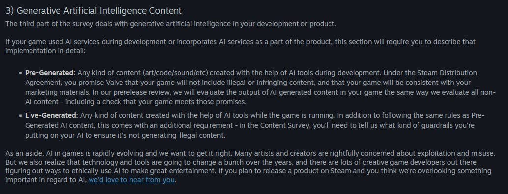动视的 Steam 披露可能意味着从加载屏幕到关卡的任何内容,所以让我们回顾一下它是什么实际上要求这里。去年 1 月,Valve 花了“一些时间来了解这个快速发展且法律上模糊的领域”后,这一政策变更被公开。它要求游戏提交详细说明“在开发过程中在人工智能工具的帮助下创建的任何类型的内容(艺术/代码/声音/等)”。