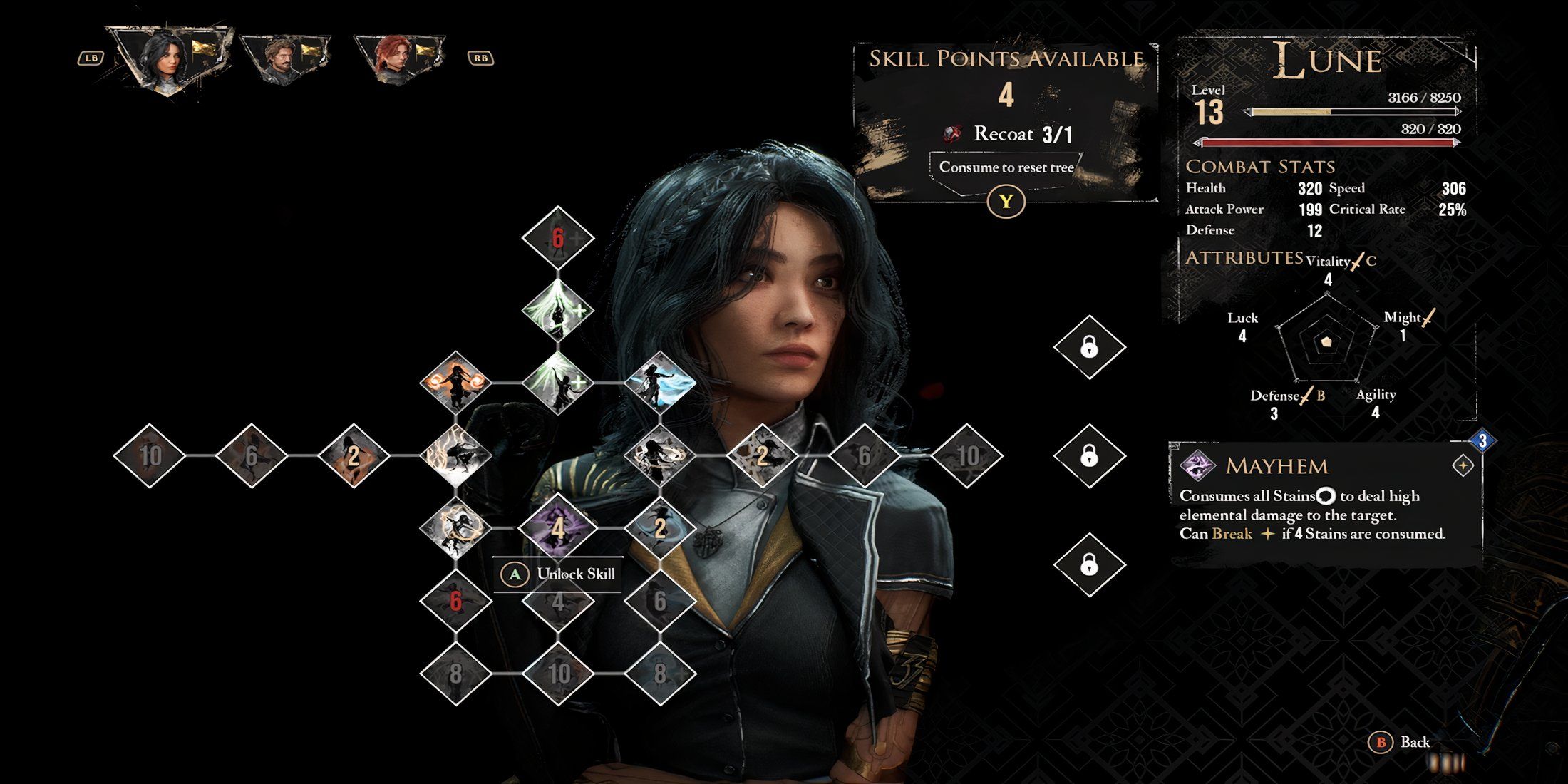 中的每个角色明暗对比:远征 33有技能树。角色升级时,会获得1点技能点和3点属性点。技能点不共享,可以解锁在战斗中使用的法术或能力,从剑攻击到火焰漩涡。