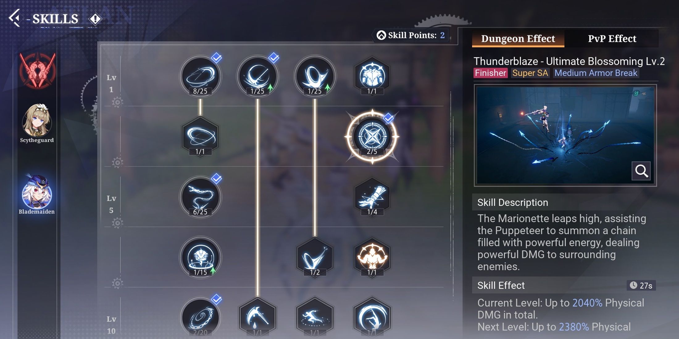 Blademaiden 的默认终极技能几乎与 Scytheguard 相似,但第二个终极技能(在 45 级解锁)具有更广泛的范围,尽管它仍然需要单个目标来激活终极技能,这再次使其最适合 Boss。