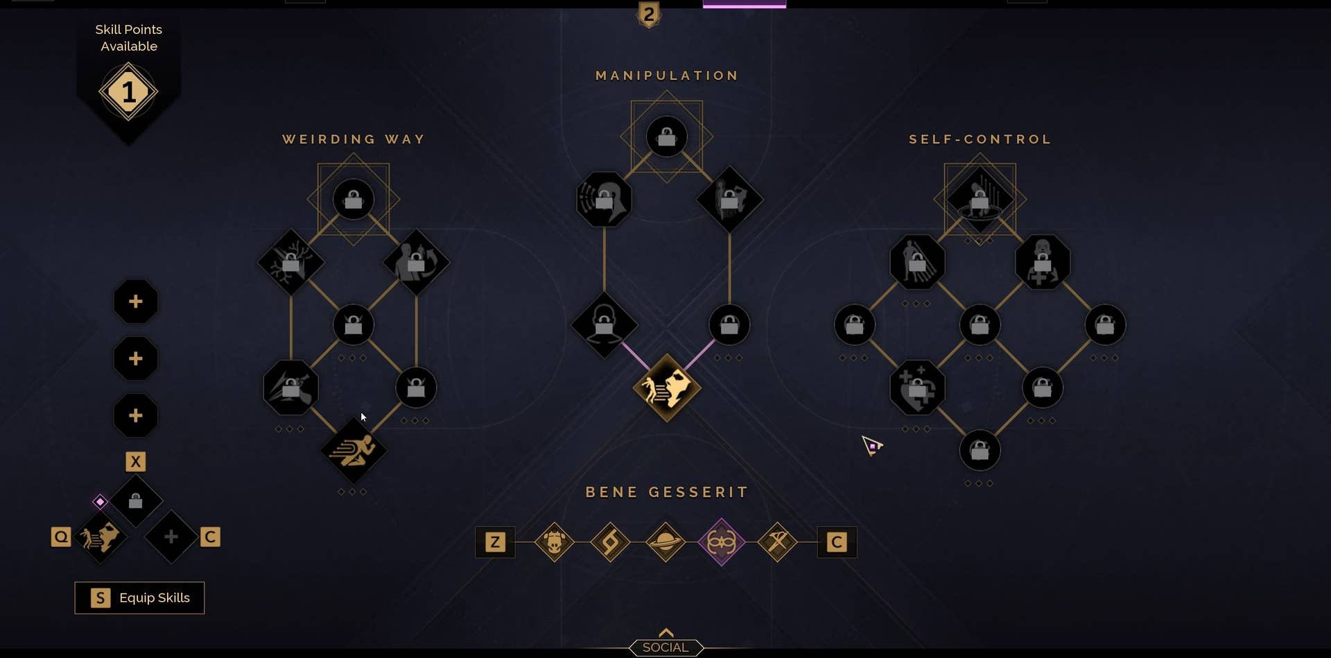 但我失去的只是物质上的东西。这是一种角色扮演游戏,意味着有角色等级、技能树和能力可供学习,如果你死了、沙虫或其他什么情况,你也不会失去这些。我选择了贝尼·杰瑟里特原型,所以我提到的神奇冲刺就来自于此。它可以让我像闪电侠一样冲刺一小段距离,这既有用又有趣。我还可以利用声音的传奇力量迫使敌人跑向我并呆呆地站在那里,或者让他们在我走过时不注意到我。或者,如果我感觉好斗,我可以将点数注入到军事实力中,并做一些事情,比如立即出现在敌人背后进行背刺,哇-砰!这里似乎有很多令人愉快的选择,我被告知我们可以自由地重新指定并解锁几乎所有的选择。该策略来自于选择积极使用哪三种能力。