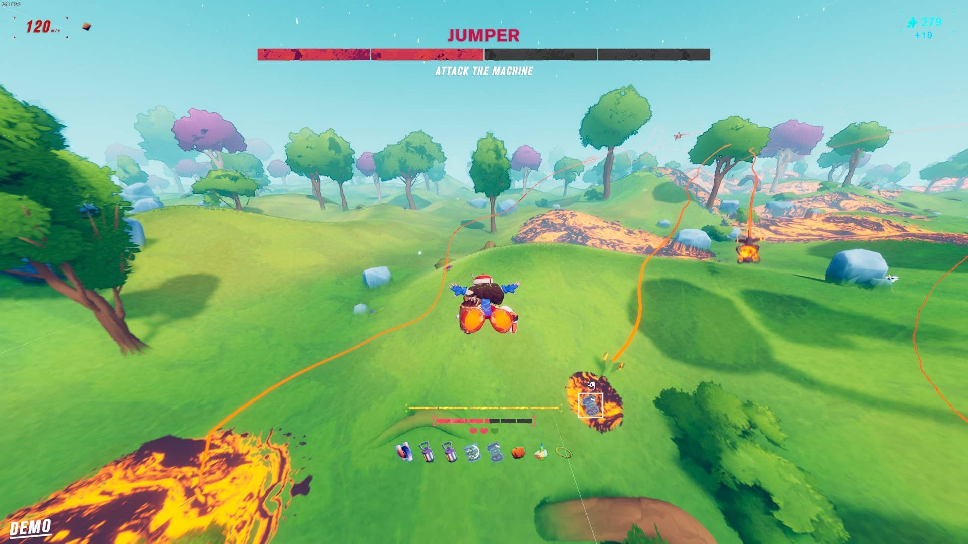 虽然在《Haste》中除了向前奔跑之外你不会做太多事情,但它热衷于提出更多的挑战,而不仅仅是寻找完美的赛车路线。随机的障碍物范围很广,从简单的树木和带刺的藤蔓到巨大的激光,上升的熔岩池遮住了除了少数珍贵的斜坡之外的所有斜坡,最后,你以 120 公里/小时的速度正面冲入,击败了一个巨大的机器人的火箭弹幕。