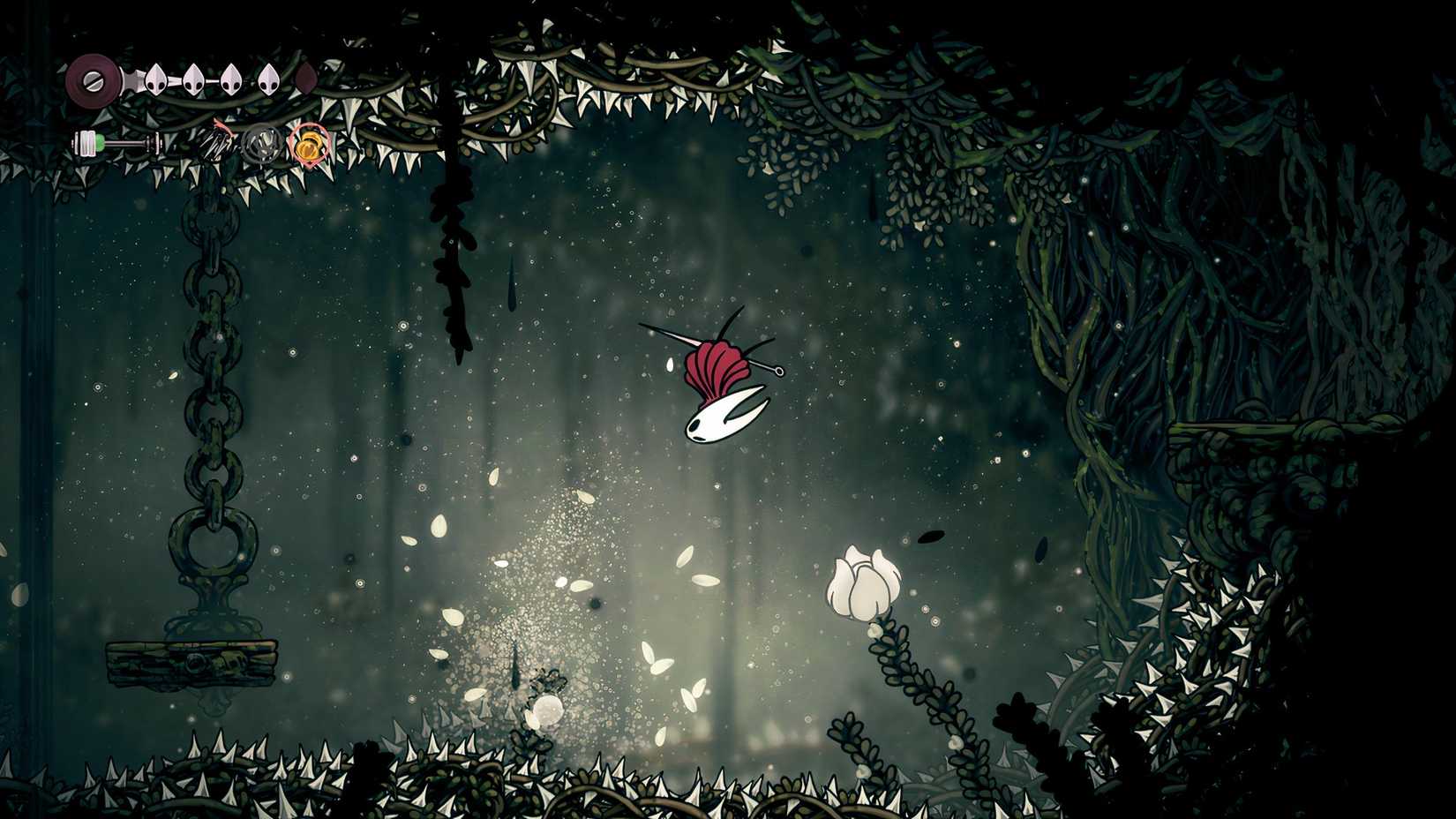 Pogoing 更像是一种发射台的情况,玩家一旦击中悬浮在半空中的环境物体,就会被抛回空中,准备好朝下一个方向进行 pogo。这在战斗中也非常有效,玩家会反射敌人并将自己发射到空中,准备重新定位或着陆他们的下一次定向弹簧攻击,而相比之下,《空洞骑士》的战斗则非常僵硬。