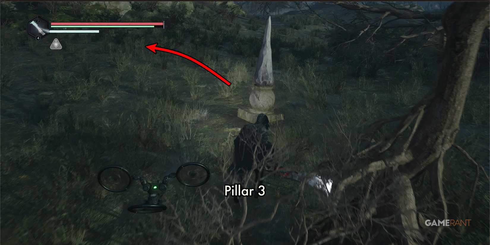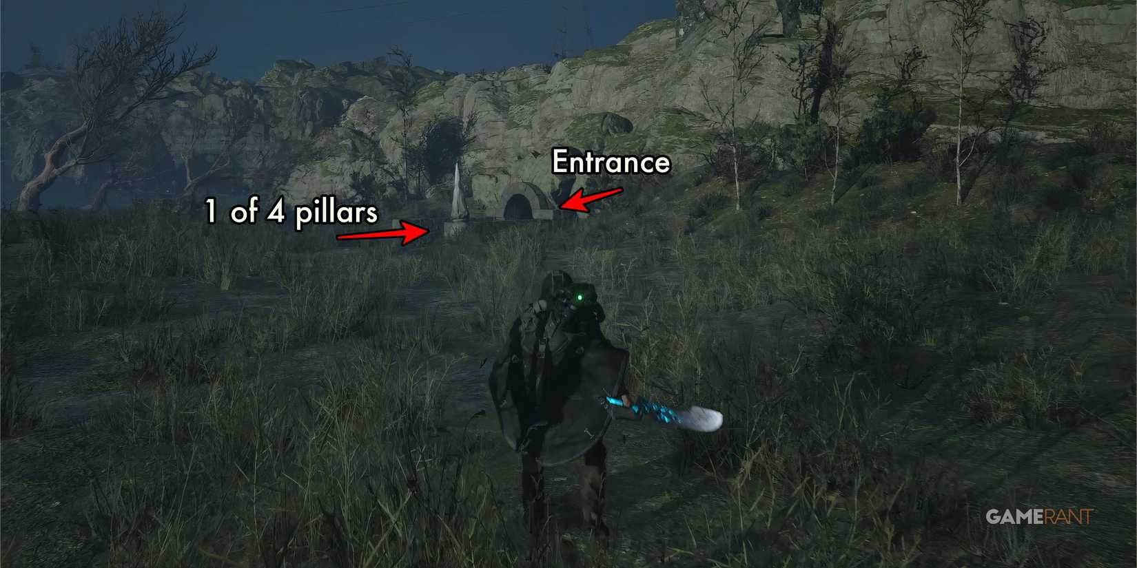 到达纪念碑山底部后,前往东北侧,靠近东部长方体的底部。在那里,你会发现一扇建在山上通向地下的石门,还有四根奇形怪状的柱子。这些柱子似乎有一个罐子状的底座,顶部有一个圆锥形的尖刺。