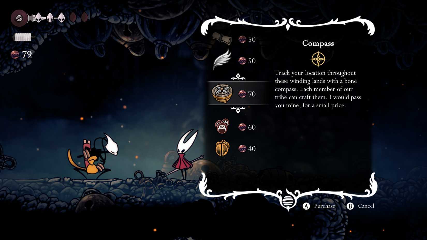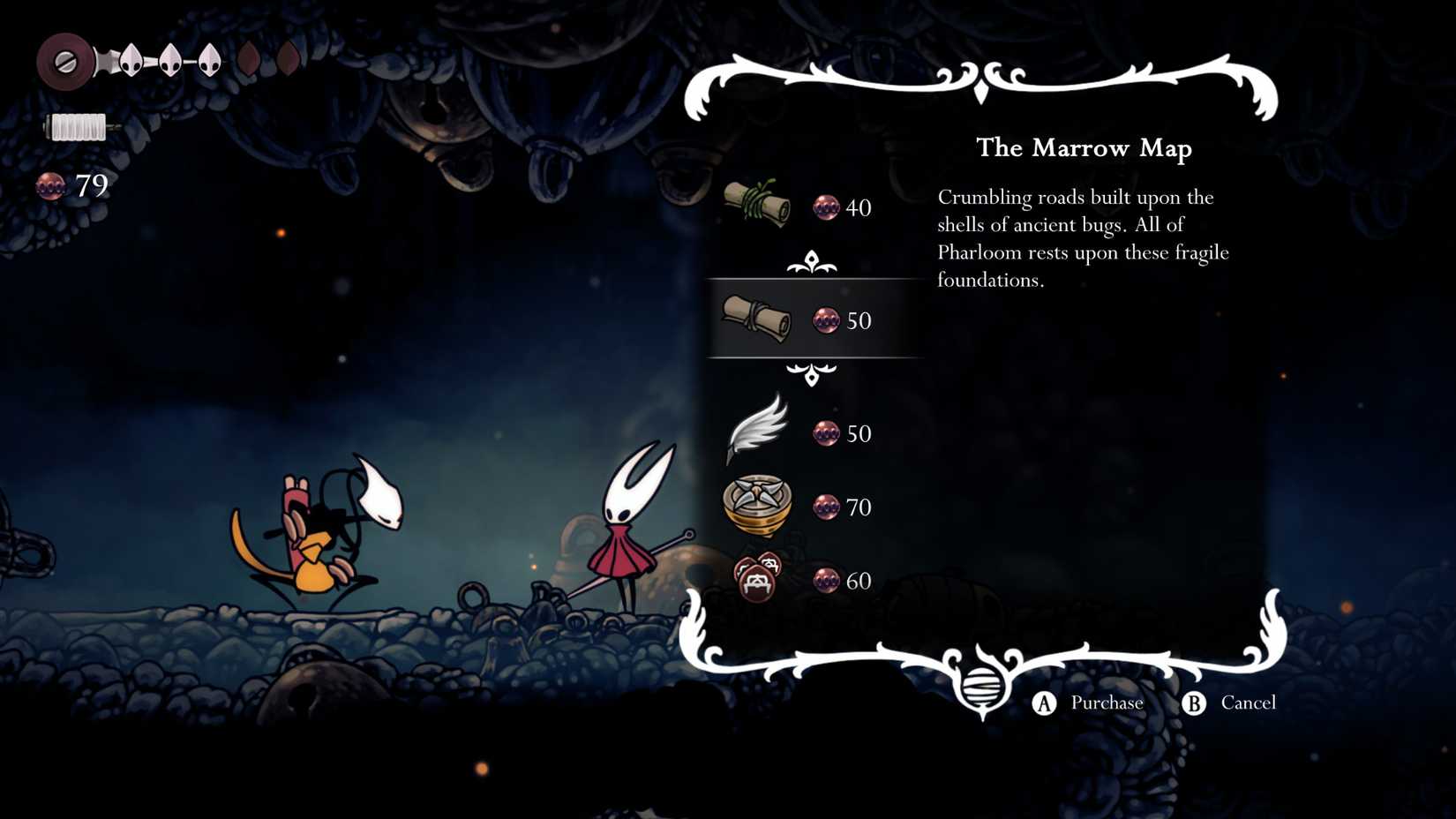 这位武士制图师自我介绍后,会提供一系列精选商品来换取念珠——包括Silksong玩家可以获得的第一张地图。这莫斯兰地图花费 40 念珠,而骨髓图花费 50。