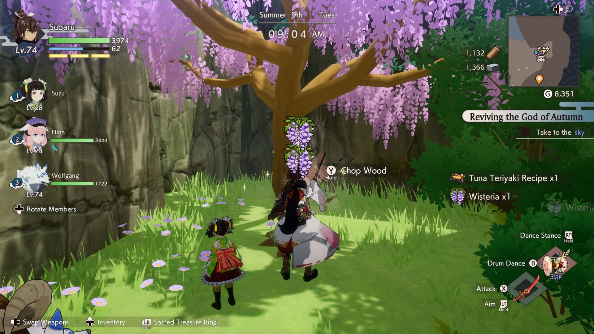 紫藤是一种树,可以通过砍伐它来获得花朵。虽然可以在任何村庄种植紫藤树,但当我这样做时,这棵树不会给我紫藤,只会在我的库存中添加木材。相反,我通过去花村得到了紫藤。这是一个天空中的岛屿,作为主线任务的一部分,你将访问它,但你可以随时通过在查看地图时使用“扭曲子菜单”选项重新访问它,方法是在 Xbox 上按 X、在 PlayStation 上按 Square、在 Nintendo Switch 上按 Y。