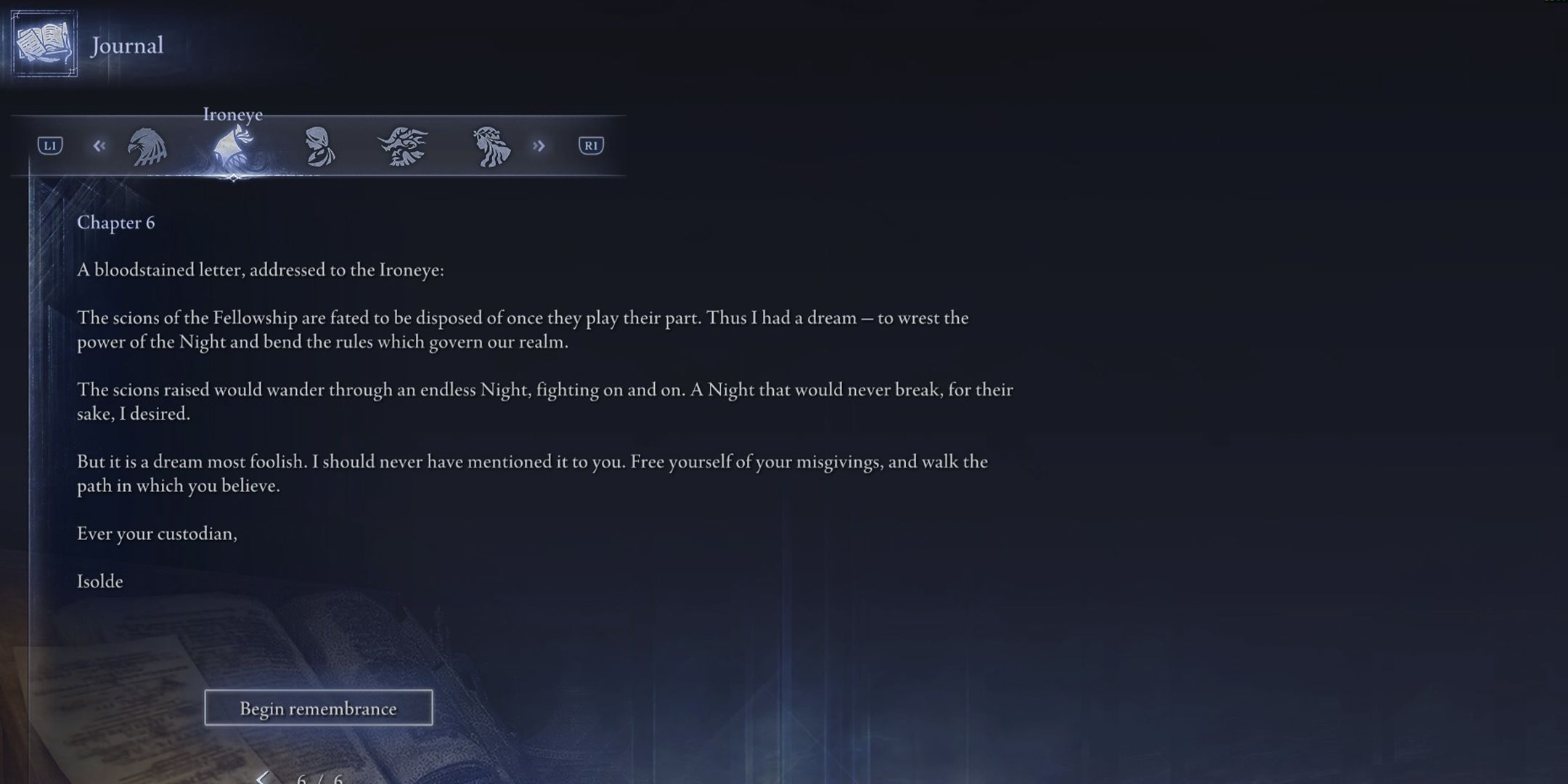 在《埃尔登环夜行》中击败至少四名夜领主后,您才能解锁铁眼的第 6 章和第二个回忆。这可以通过以下方式完成任何特点。