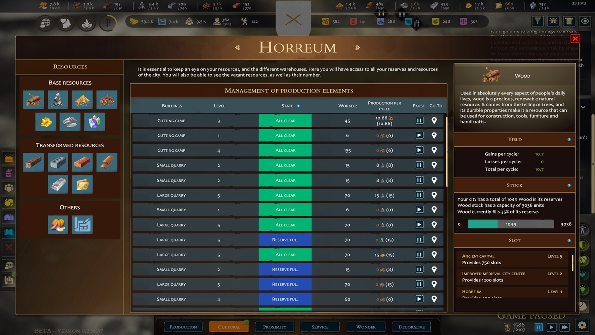 从 Horreum 中,您可以暂停特定资源的生产或监控哪些建筑物已达到最大存储容量,但它不会增加任何资源的基础储备。