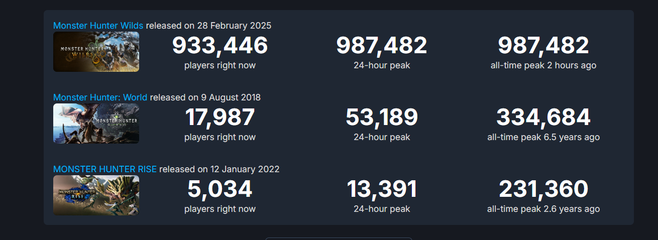 在撰写本文时并根据蒸汽数据库Valve 平台上有 933,446 名《Monster Hunter Wilds》玩家。目前,该游戏的玩家人数达到了 987,482 人的历史最高水平,尽管该数字很可能会在周末突破这一数字。这使得《Wilds》成为 Steam 上玩次数最多的游戏之一,超过了《博德之门 3》甚至《Elden Ring》等游戏的玩家人数峰值。