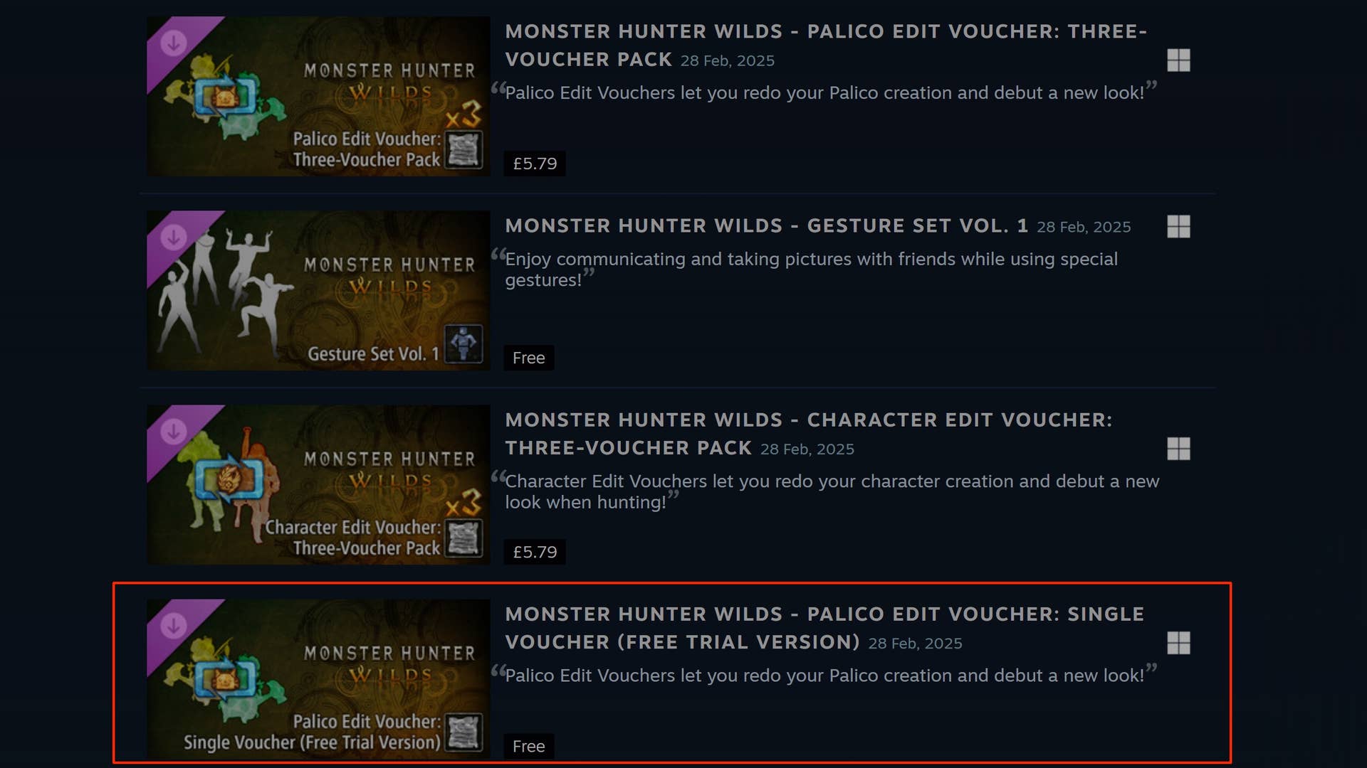 不过,不要急于咳嗽。 Capcom 还发布了“角色编辑优惠券:单一优惠券(免费试用版)”,以及 Palico 的同等优惠券,您可以免费下载,但每个优惠券只能下载一次,然后在保存选择屏幕上访问角色编辑器。如果你想知道,是的,在忘记了免费优惠券的存在之后,我差点付钱去换我愚蠢的白痴帕利科——这就是为什么我现在写了五段关于你可能已经知道的事情。
