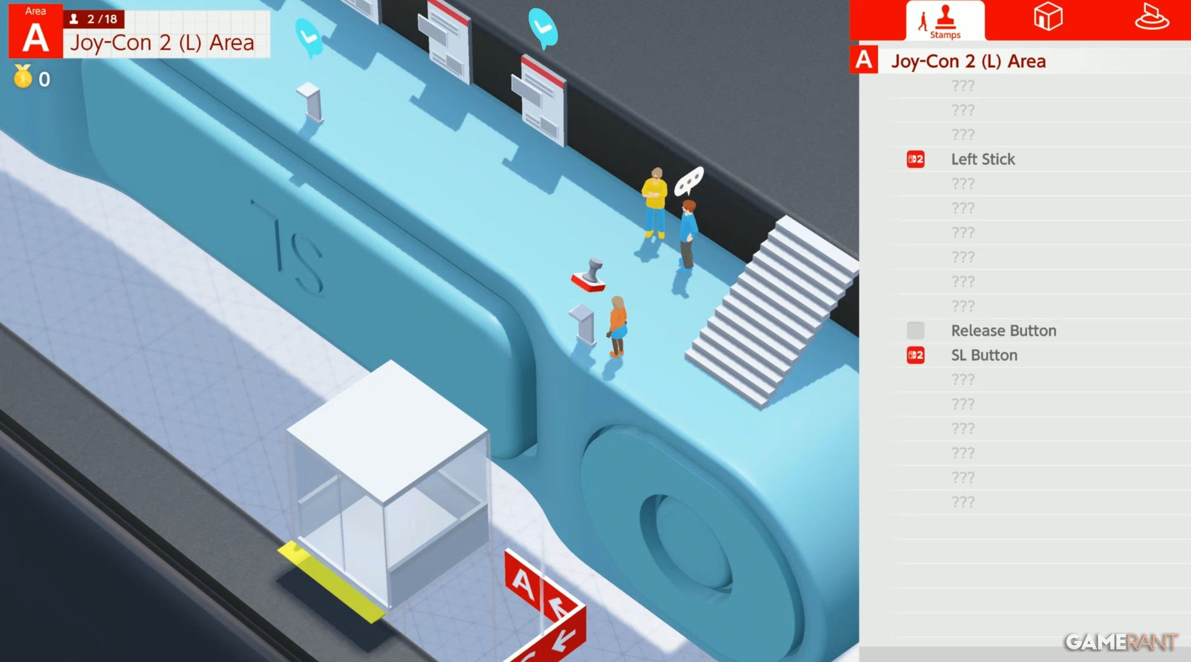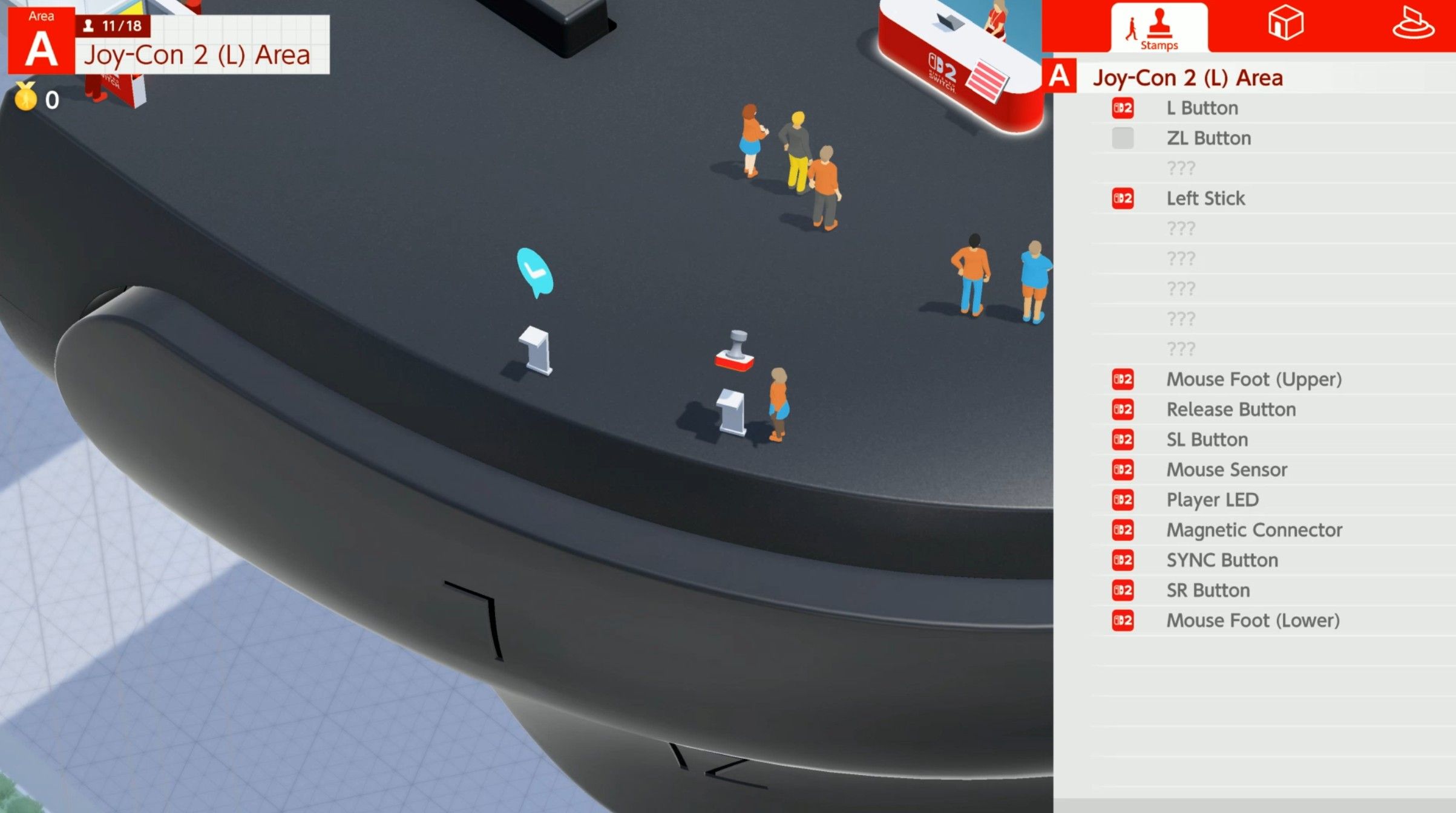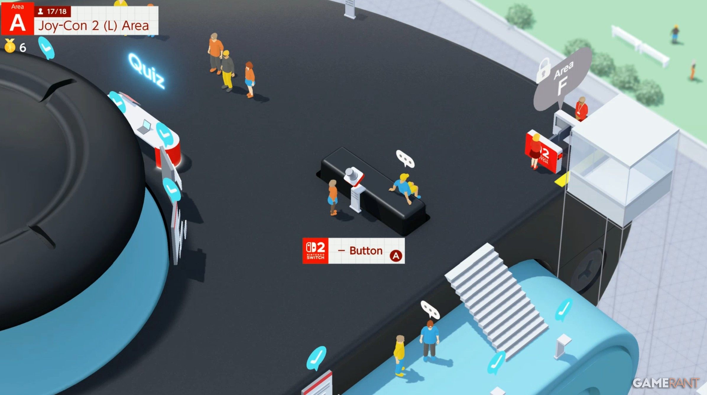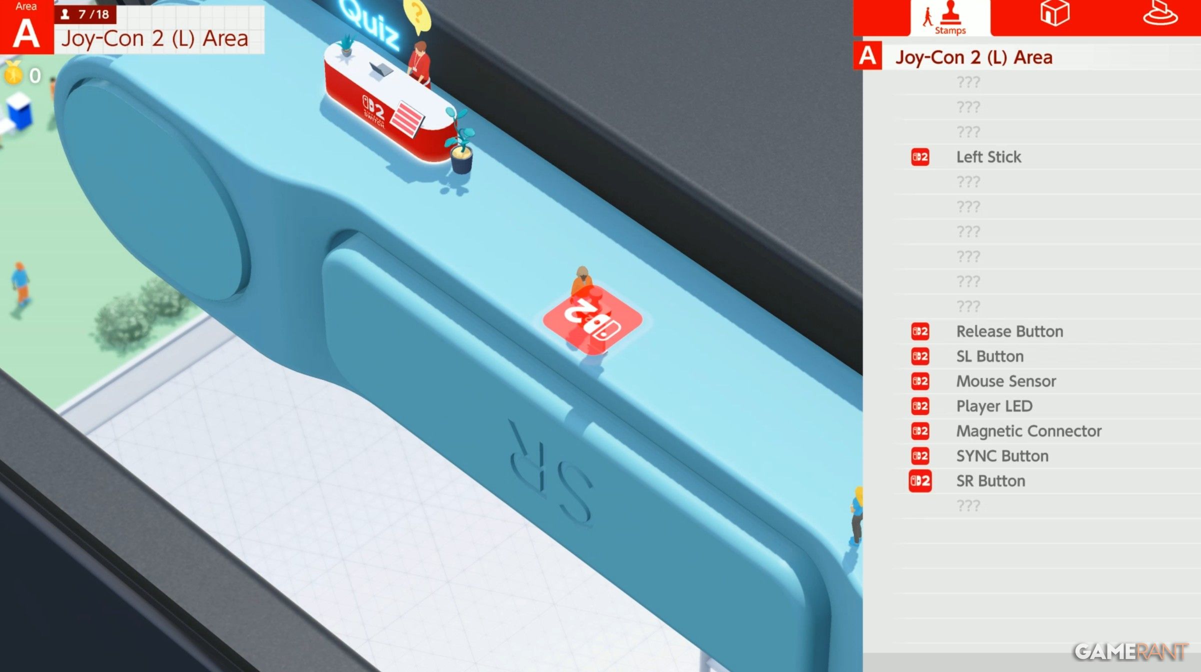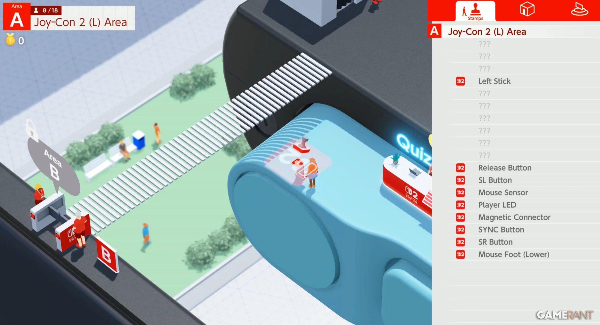 选择您的外观后Nintendo Switch 2 欢迎之旅,您将能够探索游戏的第一个区域,即 A 区,该区域将突出显示任天堂最新游戏机的左侧 Joy-Con。有几个迷你游戏可以尝试,可以玩技术演示,18邮票收集,以及三个测验通过(或失败!)