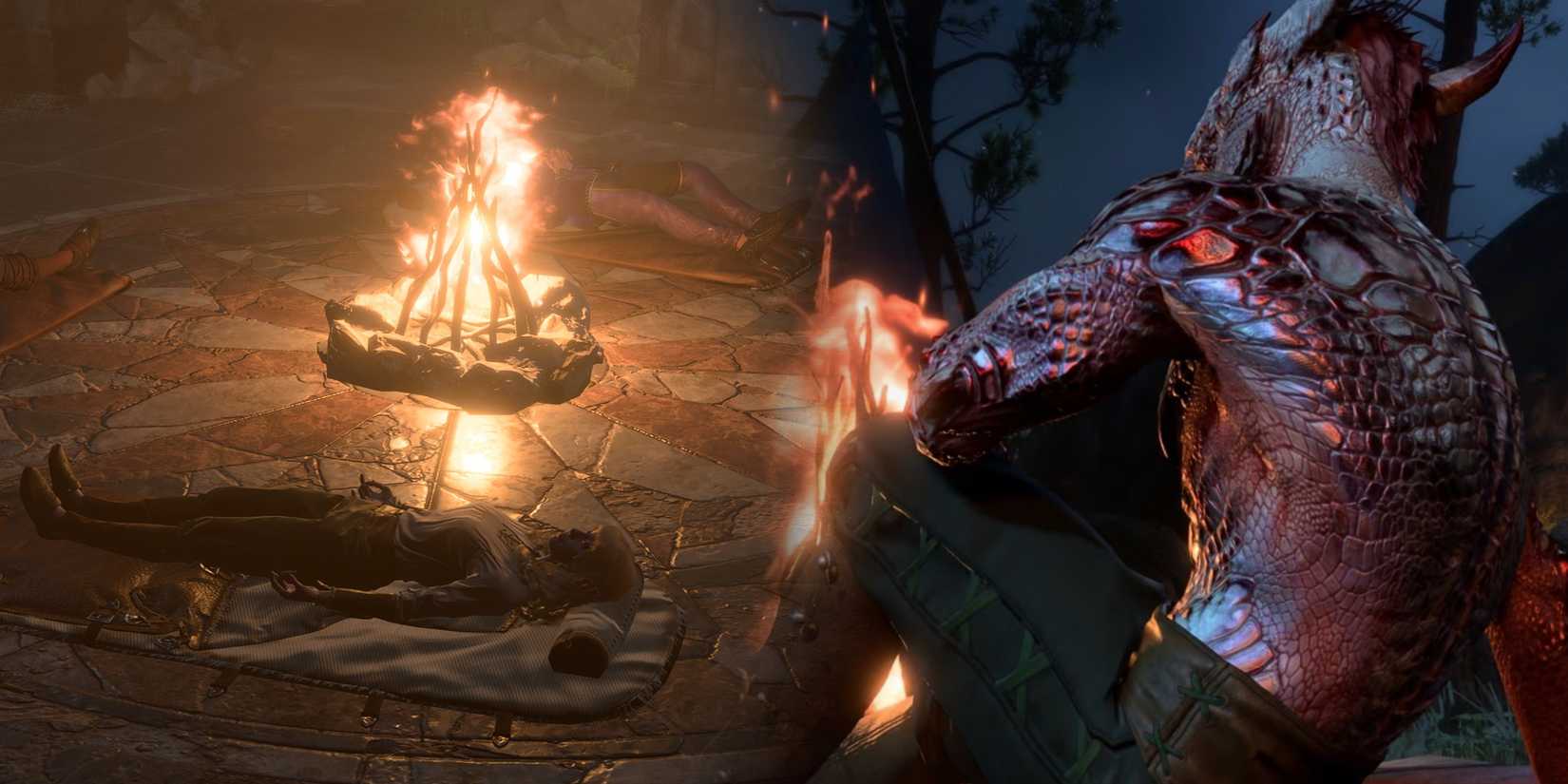 《博德之门 3》中队伍在长眠期间睡觉的屏幕截图,以及夜间营地过场动画中黑暗冲动玩家的屏幕截图