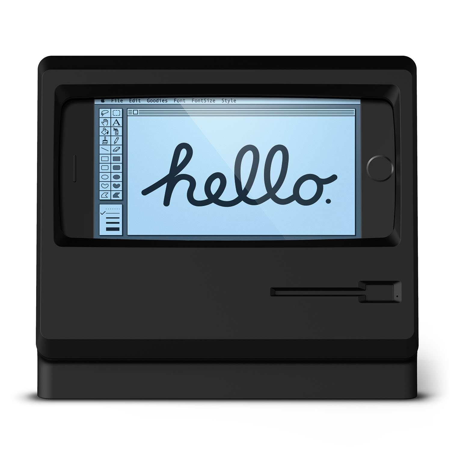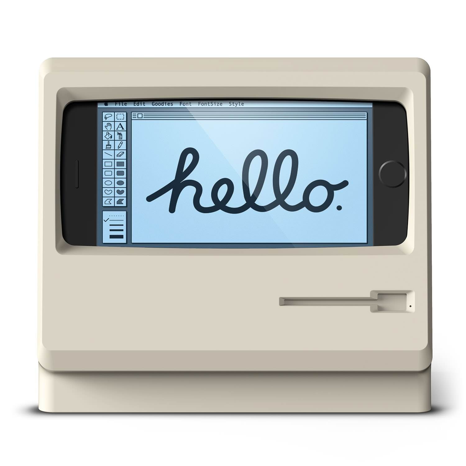 采用 Macintosh Plus 风格设计的 iPhone 支架。elago M4 支架 iPhone7」正在发售。有经典白和黑色两种颜色可供选择,各售价 3,990 日元。