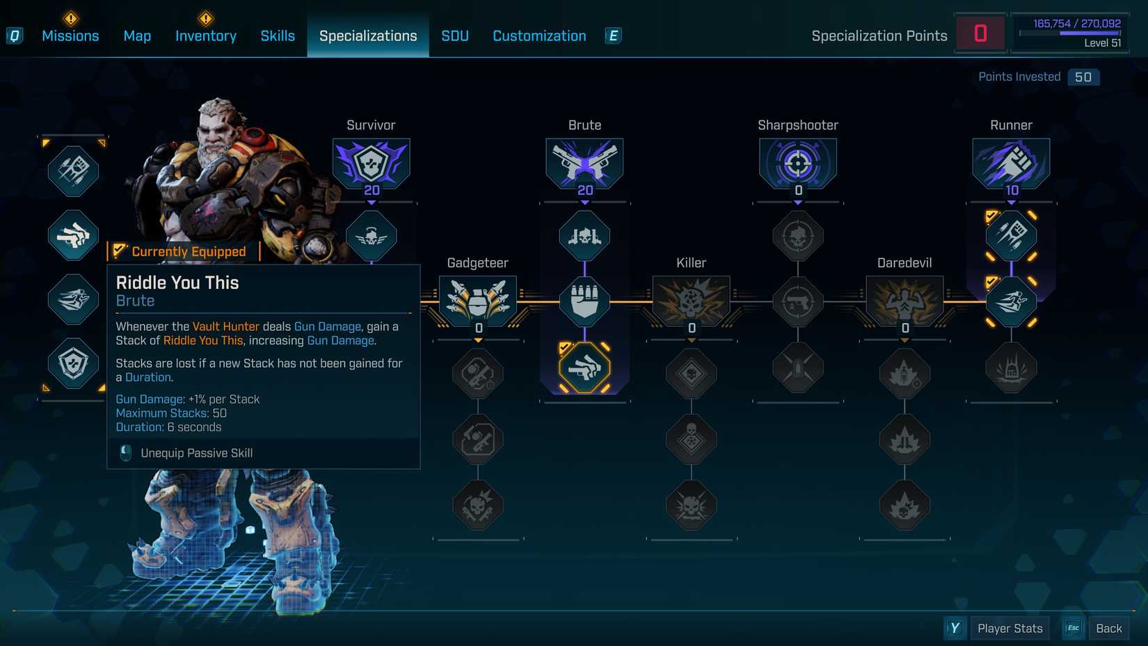當玩家開始獲得專業化時,他們會想要投資於倖存者和野蠻人。倖存者會增加生命值和護盾,而野蠻會增加槍支傷害。倖存者中的分數越多越好,因為玩家可以使用子彈嚇到我來增加傷害減少,並使用最佳防禦來增加傷害。野蠻樹還有“Riddle You This”,只需用槍造成傷害即可提供 +50% 傷害。然後,玩家可以投資子彈頭列車的跑者,在衝刺時進行腰射,或者他們可以專注於小玩意兒,以更好地利用他們的軍械。