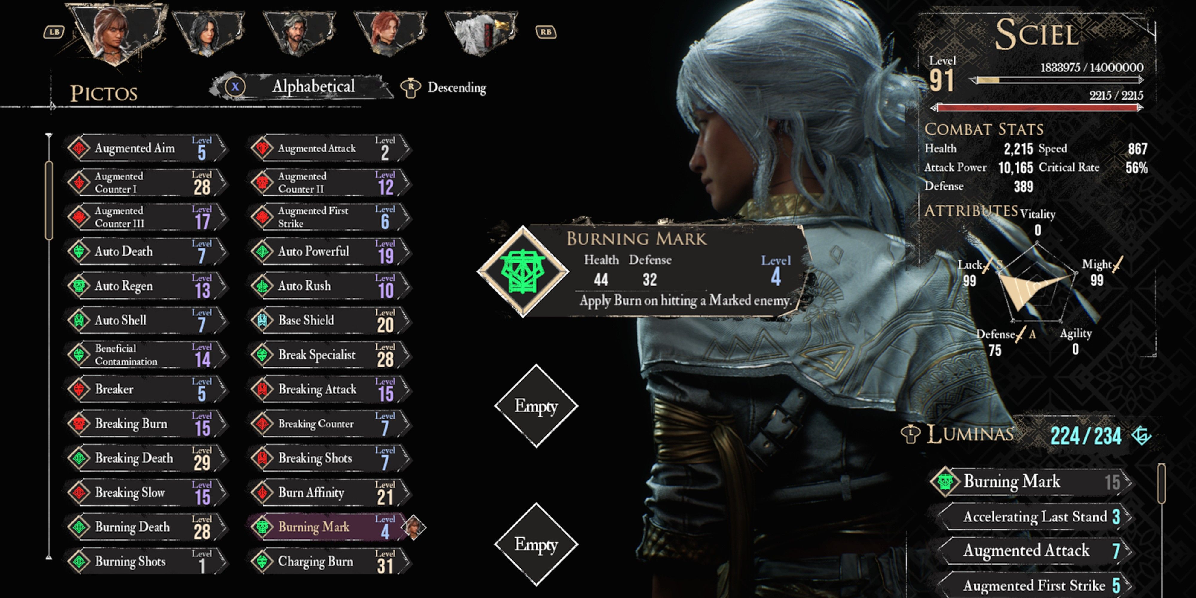 Burning Mark與Double Mark Picto具有相似的特徵和缺點,儘管這兩個Pictos可以在協同作用中起作用,但這並不值得球員所帶來的利益。儘管額外的燃燒可能會非常有益,但玩家會發現更有效的方法,通過較不昂貴的Pictos,技能甚至武器將敵人堆積到敵人身上。