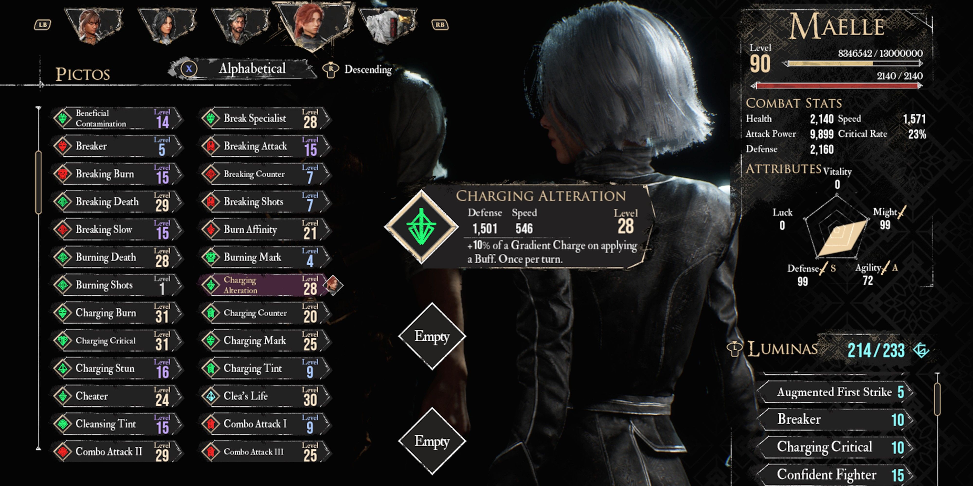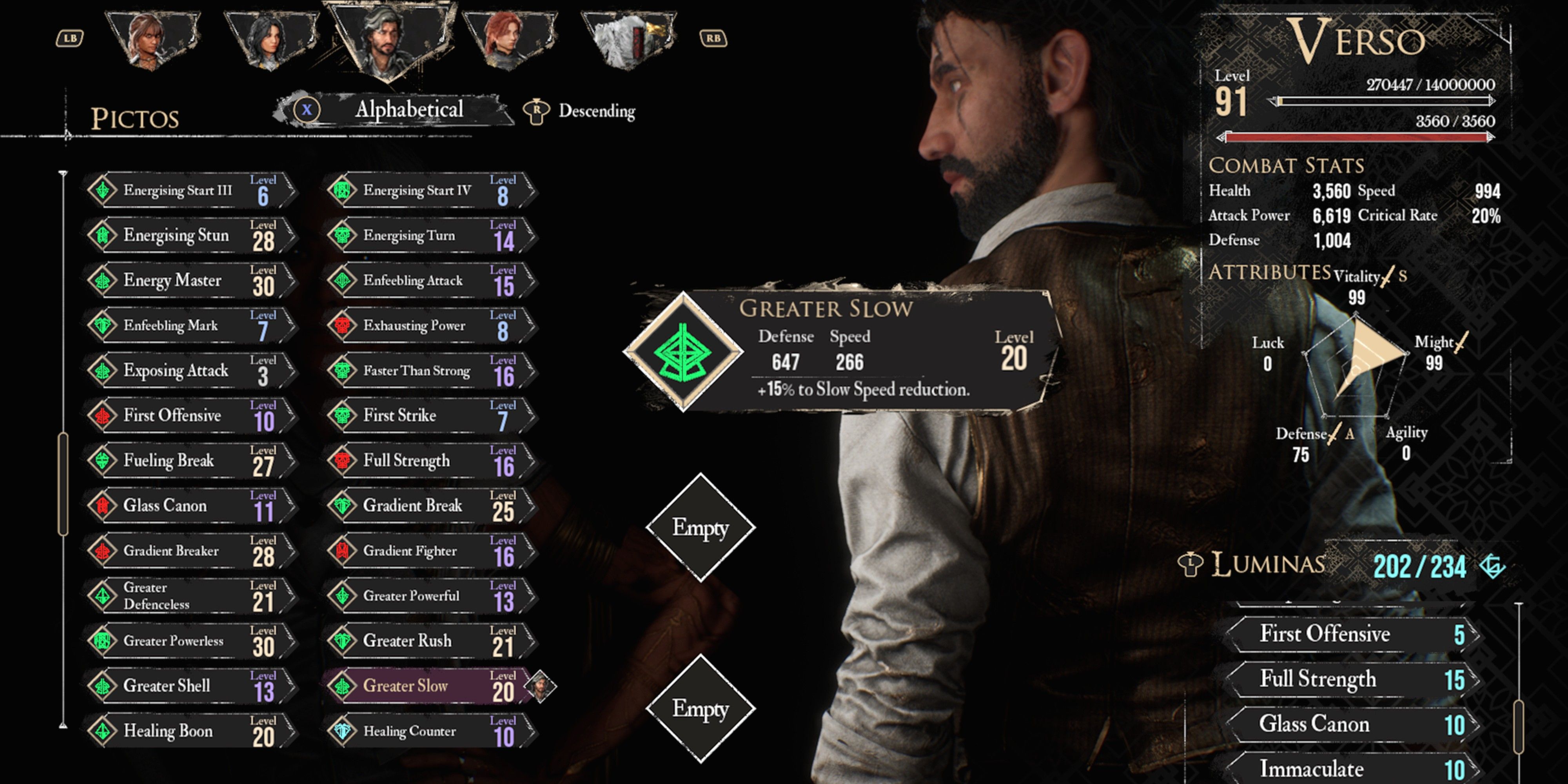 默認的慢速減益使敵人的速度降低了25%,因此在15個Lumina點獲得的一半似乎是不切實際的。為了在與迅速對手的戰鬥中獲得優勢,建議玩家依靠第一次罷工Picto並投資損失,而不是花他們的Lumina積分,從而有機會通過更大的緩慢能力來減慢老闆的速度。