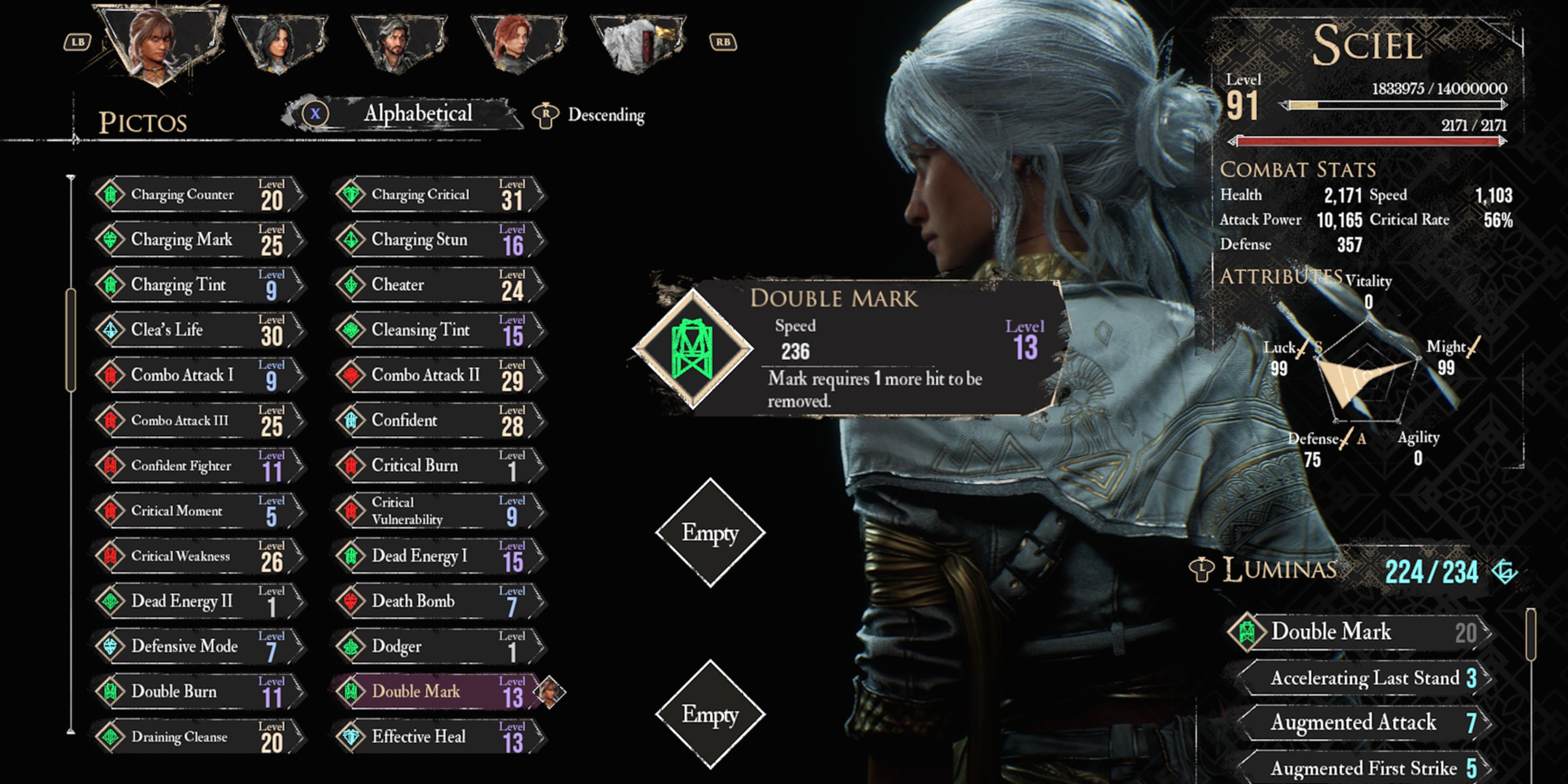 Double Mark是一個可靠的Picto變體,可以保持敵人的標記,而不必擔心會擊中他們的性格錯誤,但其效果有些過高。收集Pictos後,玩家會發現,如果需要,有很多方法可以簡單地在敵人身上放置新的標記,既可以使敵人自由射擊或基本攻擊來標記敵人,也可以通過每個角色可用的眾多技能。