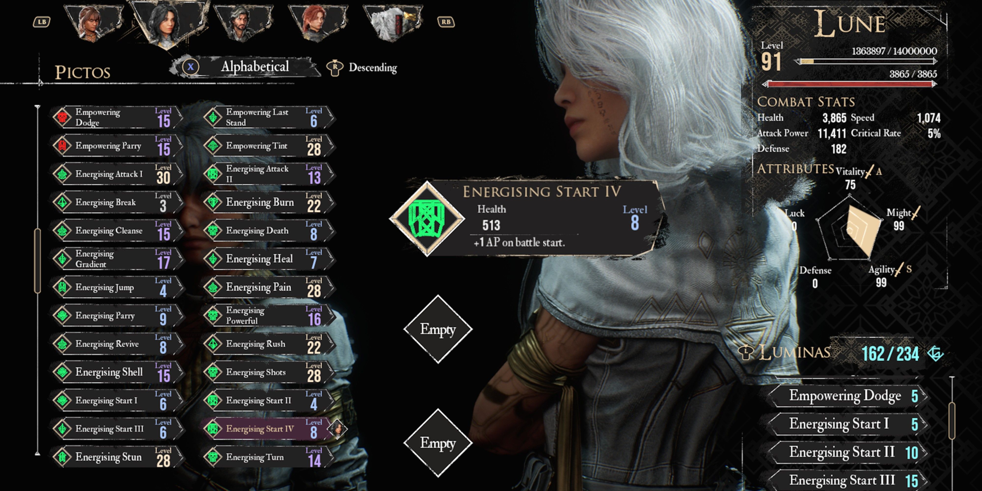 精力充沛的開始PICTOS是具有昂貴技能的角色最適合的,因為此Picto的每一層都有一個額外的動作點(AP)。但是,隨後的每個層的成本都顯著上升,為每個新的Picto的成本增加了5個Lumina點。這使充滿活力的開始IV對IT授予的單個AP來說太昂貴了,儘管它通常是理想的特權。