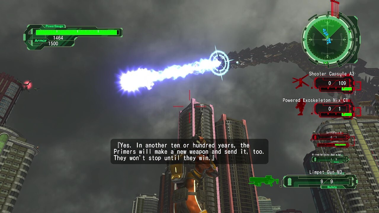 經過一場漫長的戰鬥,你似乎摧毀了這艘船,卻發現它的船頭已被 EDF 5 中的最終 Boss 取代:一個神一樣的存在,擁有改變現實並從無到有創造生命的力量。當你繼續戰鬥時,你得知 EDF 發現這些外星人來自火星。他們向地球發射一枚火箭,試圖從源頭——現在——摧毀它們,儘管你正在與來自未來的它們戰鬥。你不能讀完這篇文章並告訴我這不是令人難以置信,而且它會變得更好。