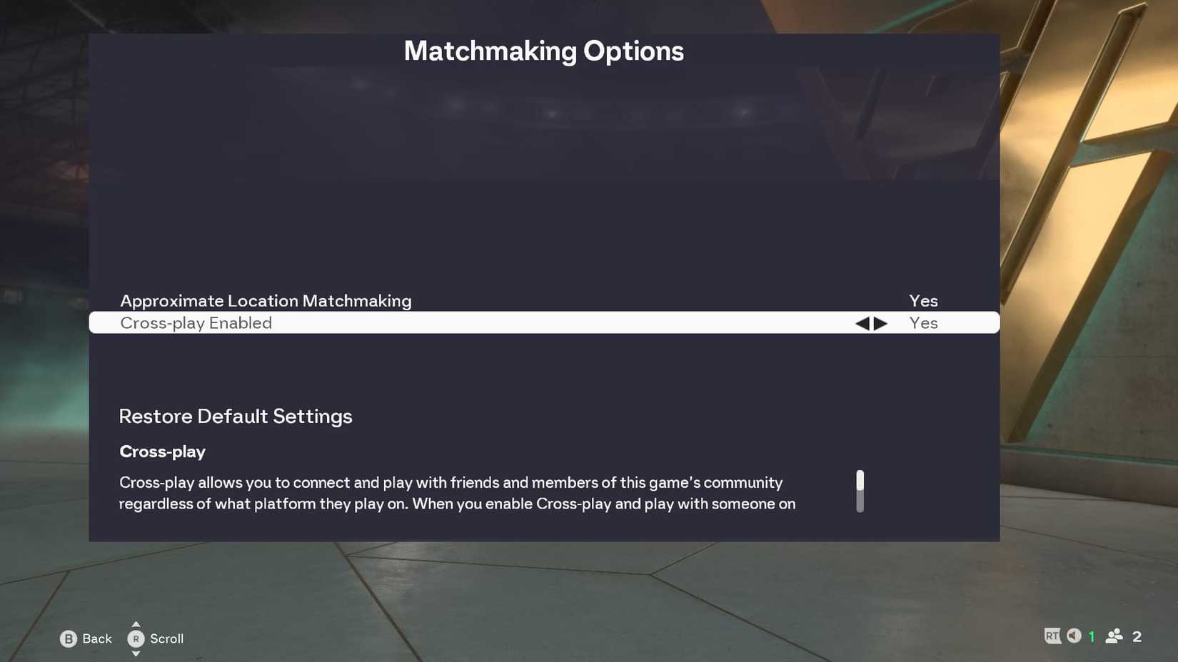 在這裡,您會發現兩個不同的選項,其中底部是“啟用跨平台”選項。只需關閉此功能,您就只能在同一平台上與其他玩家一起玩或對抗。例如,Xbox 與 Xbox,或 PC 與 PC。如果您想重新打開跨平台遊戲,請返回到此設置並將其重新打開。