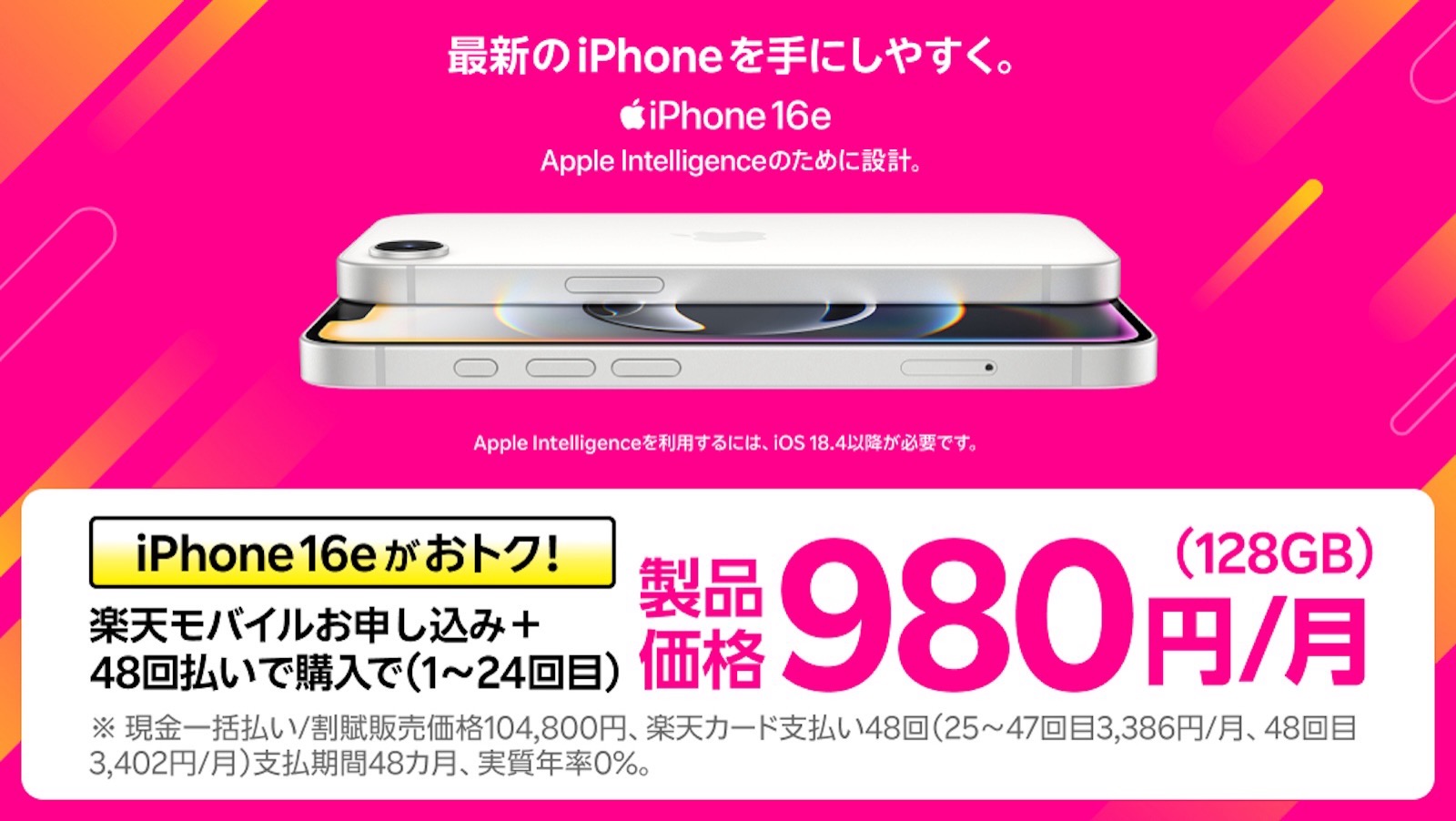 Rakuten Mobile 將於 2025 年 6 月 3 日開始運營。新活動,您可以每月以 980 日元購買 128GB 型號的“iPhone 16e”開始了。該活動是設備購買計劃的一部分“樂天手機更換超級福利計劃”並且滿足一定條件的人就有資格。